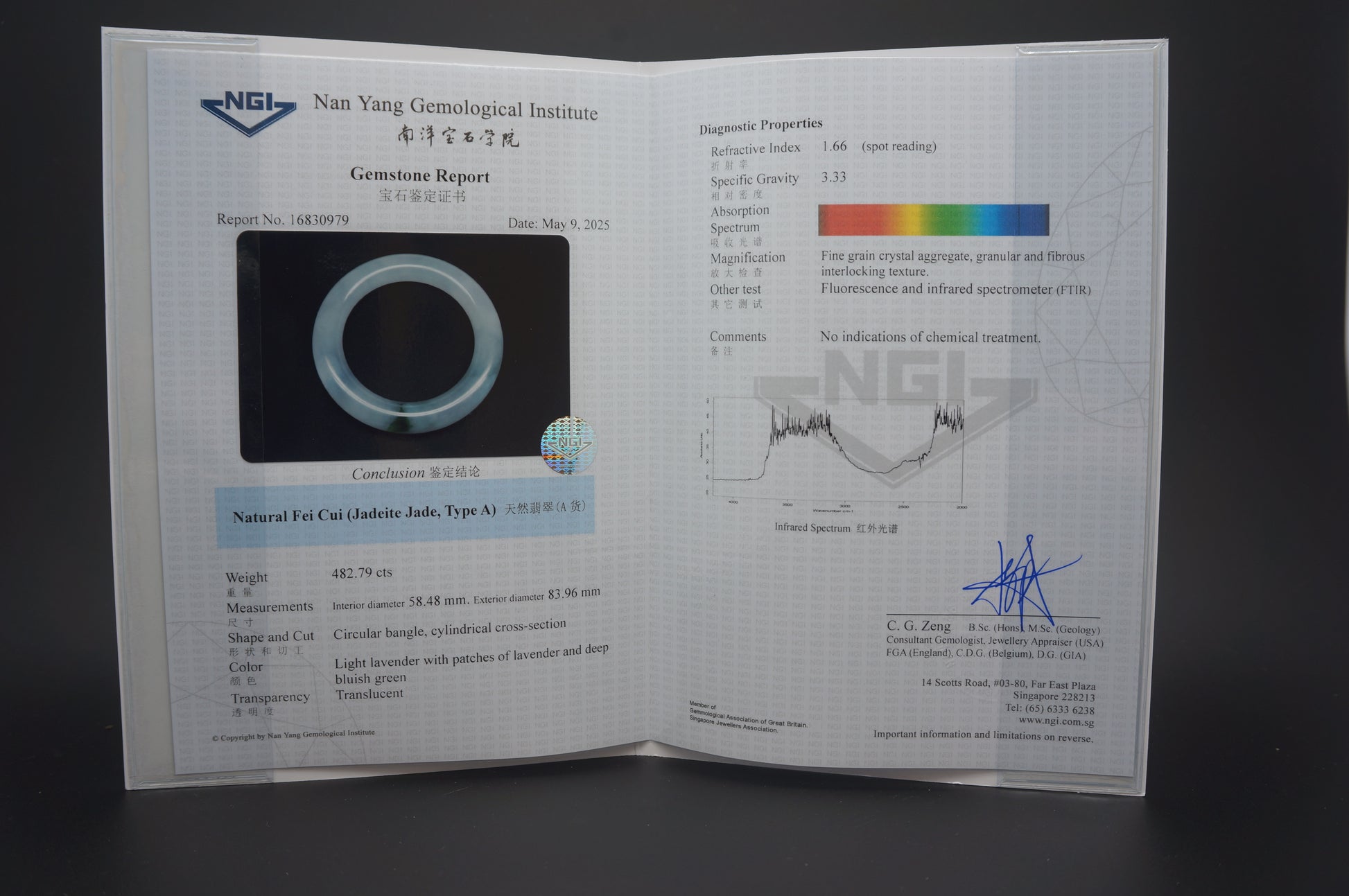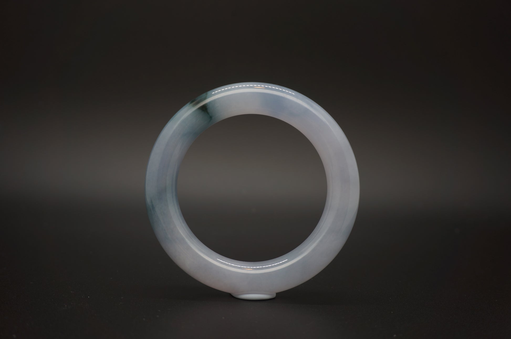 The 海雾轻纱镯 (Ocean Veil Bangle) captures the quiet mystique of drifting sea mist. Carved from translucent jadeite with swirling blue and inky green hues, this bangle evokes the depth and softness of waves cloaked in morning fog. Its glassy polish and moody elegance create a refined sense of movement and calm.