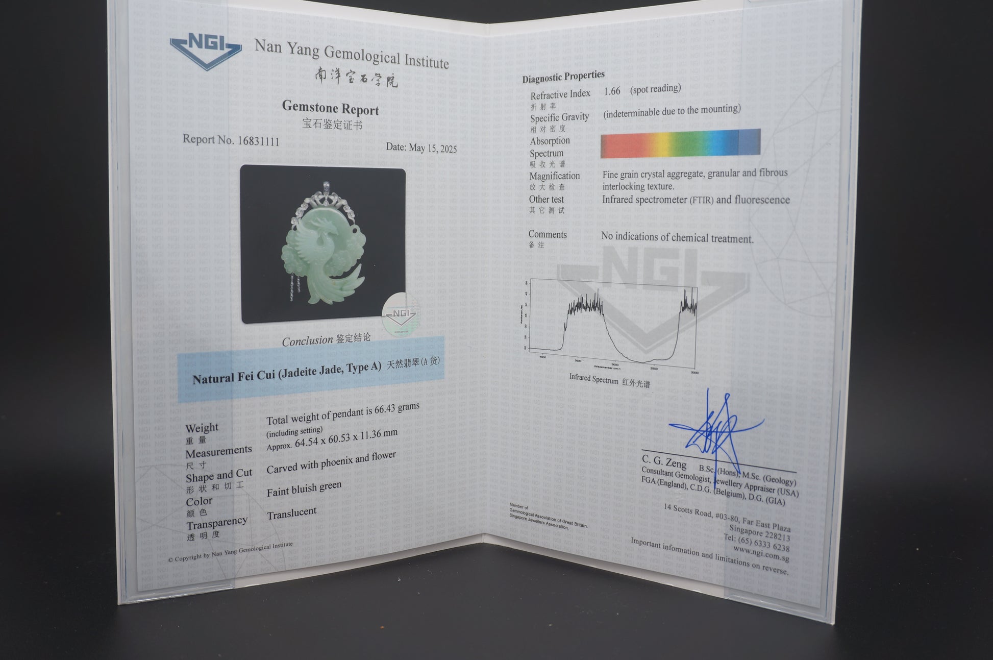 Graceful and radiant, the Celestial Phoenix Pendant captures the legendary beauty of the phoenix in flight. Carved from natural luminous jade, the phoenix rises amidst swirling clouds, symbolising rebirth, strength, and divine elegance. Delicate silver detailing and cascading beads add a refined finish, enhancing the pendant’s celestial charm. A timeless piece that blends traditional craftsmanship with ethereal symbolism, perfect for those who seek both beauty and meaning in their jewellery.