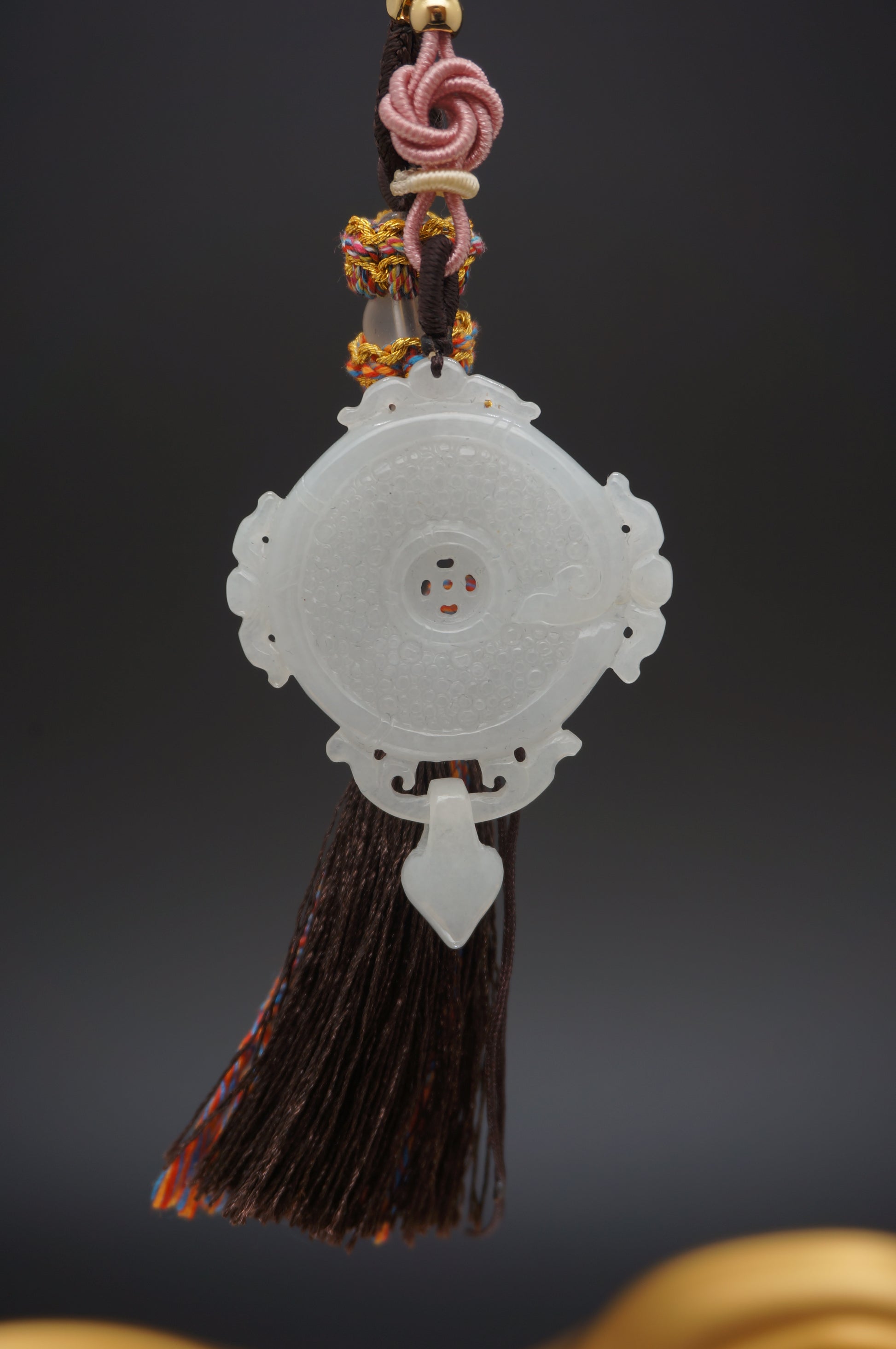 This piece is a refined symbol of guidance, clarity, and cosmic balance. Expertly carved from luminous white jadeite, its round form is intricately detailed with fine dotwork and directional motifs, resembling an ancient astrolabe or compass. Subtle cloud patterns and a pointed pendant drop complete the piece, enhancing its sense of direction and harmony.
