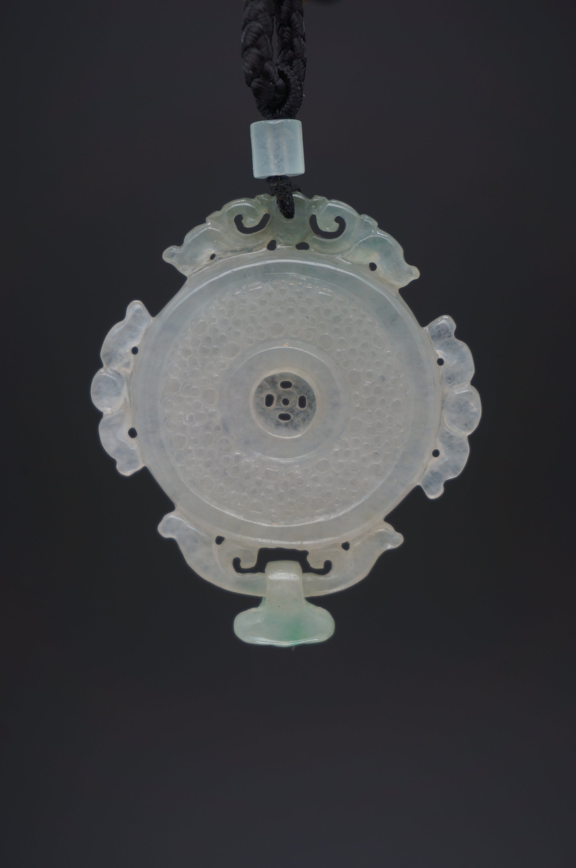 This pendant is a serene and elegant jadeite piece, carved in the shape of a radiant full moon. Its translucent white-green hue and meticulously dotted surface reflect the soft luminescence of moonlight, symbolizing purity, intuition, and inner calm. Decorative scrolls and a balanced form give the pendant a refined, harmonious presence.