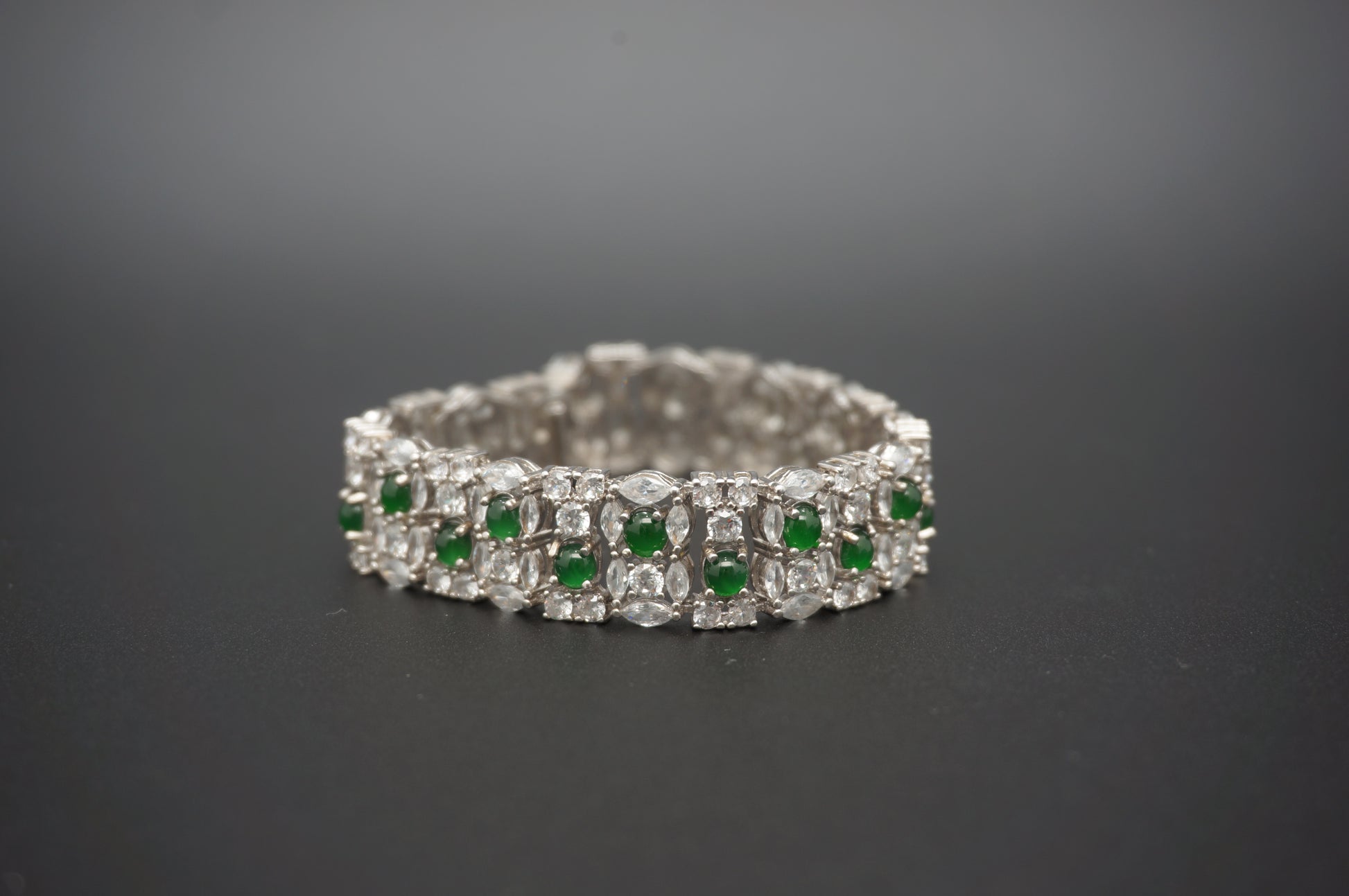 The 翡翠辉映手链 (Emerald Radiance Band) is a dazzling display of elegance and craftsmanship. Featuring vibrant green Guatemalan jade cabochons set among brilliant white stones, this ring creates a striking balance of color, light, and texture. Each gem is carefully arranged in a continuous, ornate pattern, wrapping the finger in refined sparkle and natural beauty.