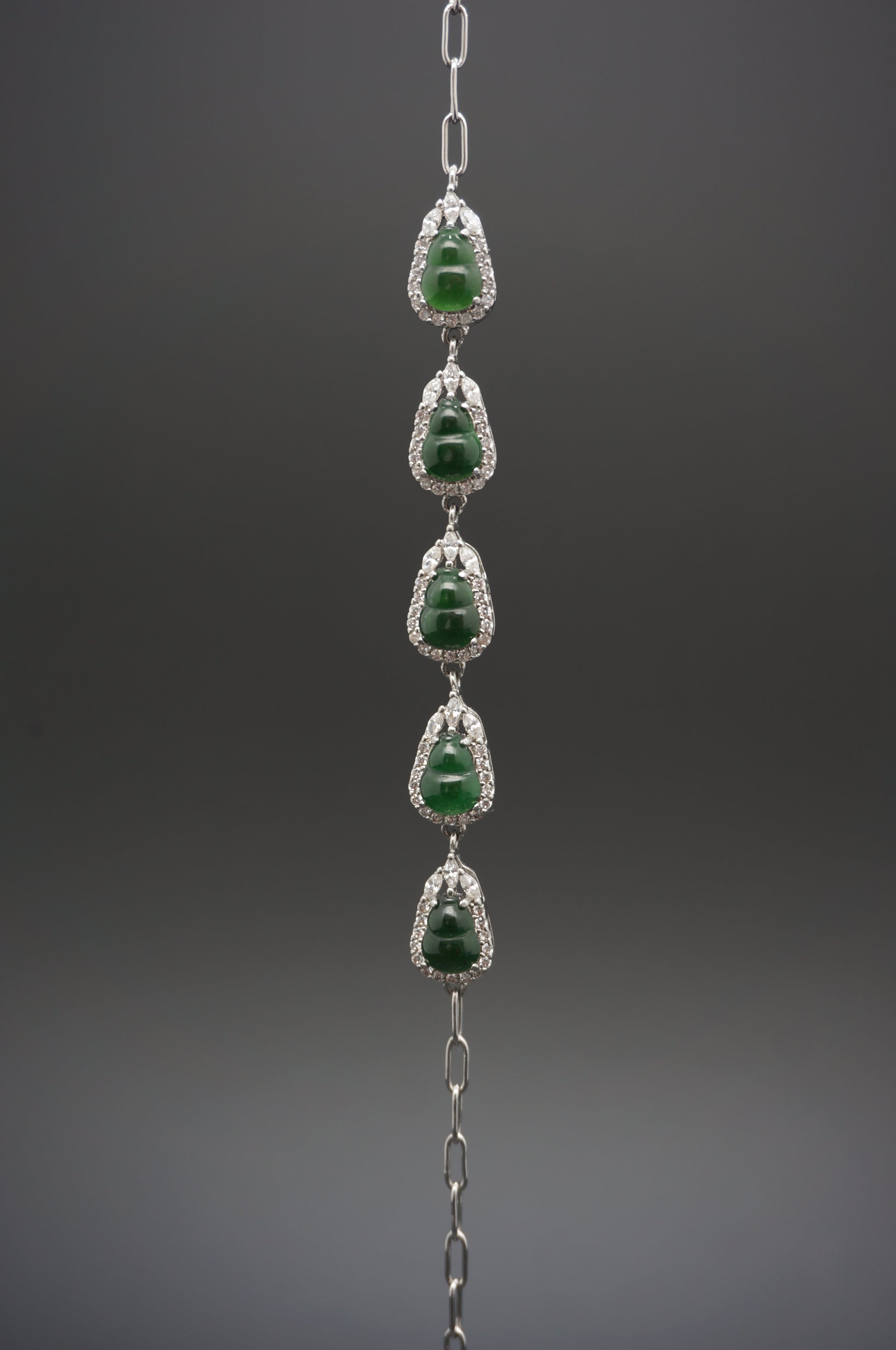 This bracelet showcases five luminous Guatemalan jade cabochons, each delicately framed in a halo of sparkling stones. Designed to resemble dew drops suspended in light, the deep green jade evokes vitality, harmony, and timeless elegance.