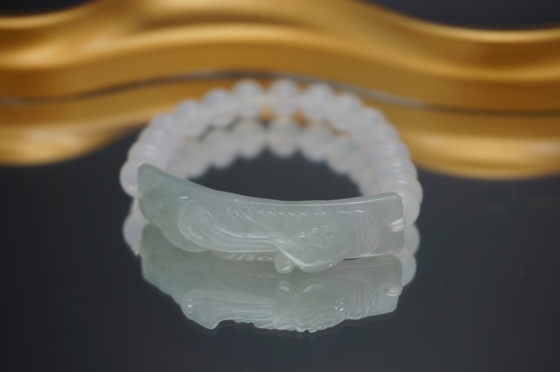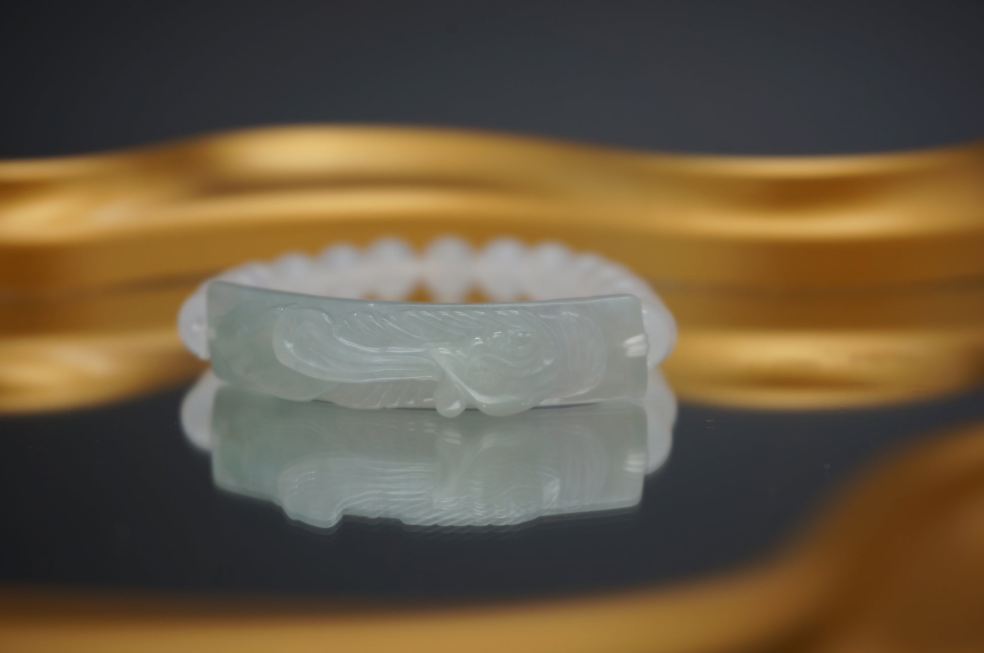 This bracelet blends refined craftsmanship with symbolic elegance. Featuring smooth jadeite beads strung together with a delicately carved central feather motif, the design evokes purity, lightness, and spiritual protection. The feather detail, etched into a pale, translucent jade arc, flows gracefully across the wrist like a whisper of divine grace.
